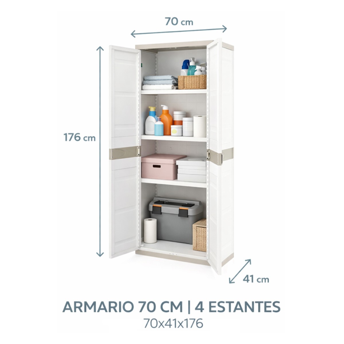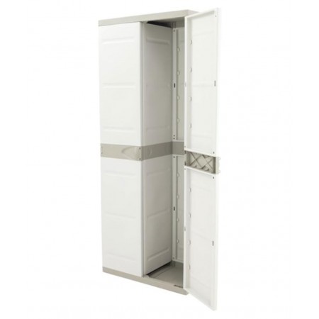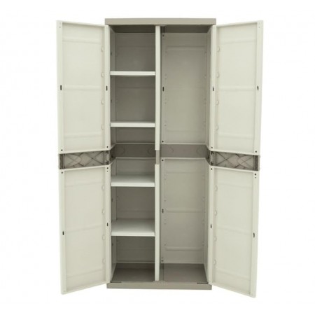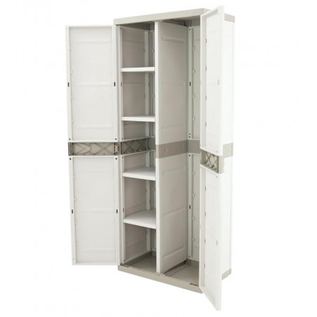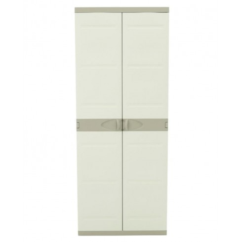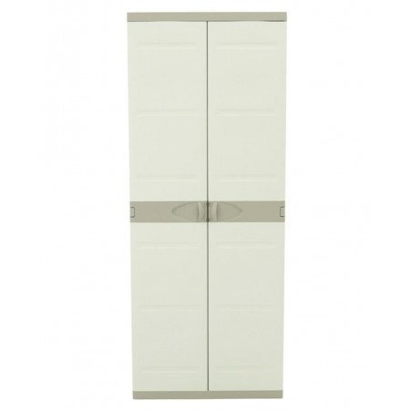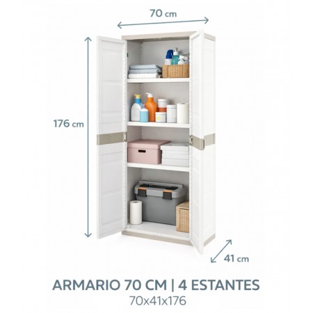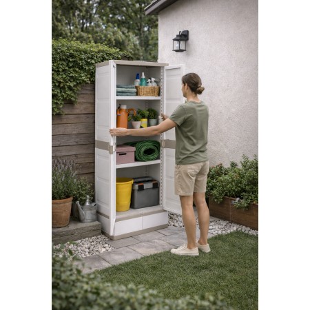 Armario de plástico para uso interior y exterior es una solución práctica para organizar objetos en el hogar, garajes, trasteros, terrazas o zonas de almacenamiento. Fabricado en plástico resistente, ofrece buena durabilidad y resistencia a la humedad, siendo adecuado para un uso diario. Su acabado en color beige neutro permite integrarlo fácilmente en distintos espacios. Dispone de dos puertas que facilitan el acceso y protegen el contenido, y cuenta con cuatro baldas regulables en altura para adaptar el espacio de almacenaje según las necesidades. Con unas medidas de 176 cm de alto, 70 cm de ancho y 41 cm de fondo, proporciona una buena capacidad ocupando poco espacio. Una opción funcional y versátil para mantener el orden de forma sencilla y eficiente.