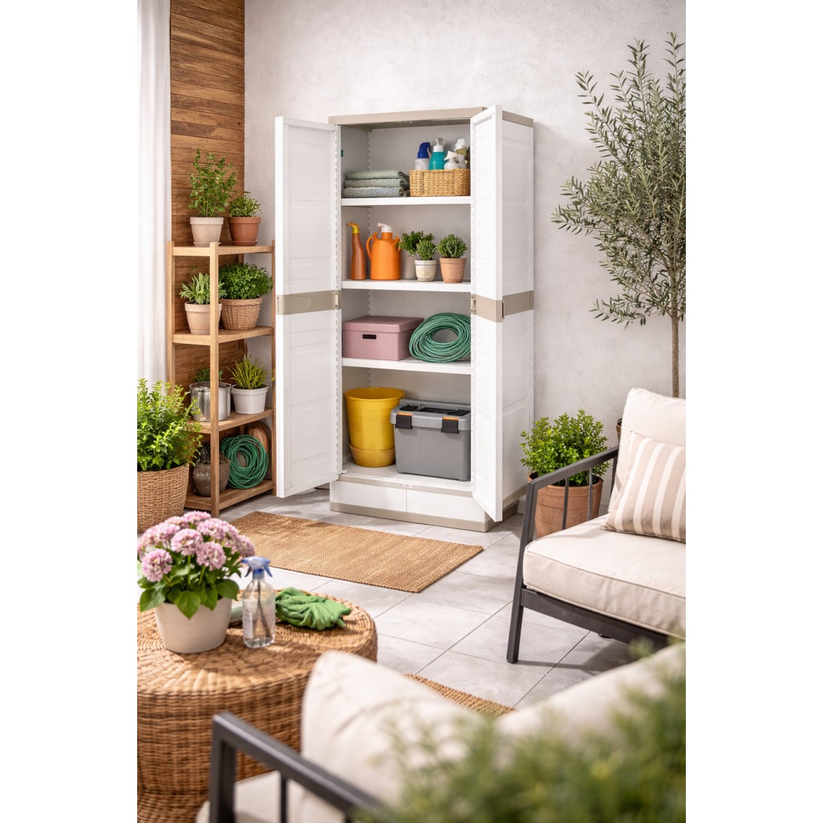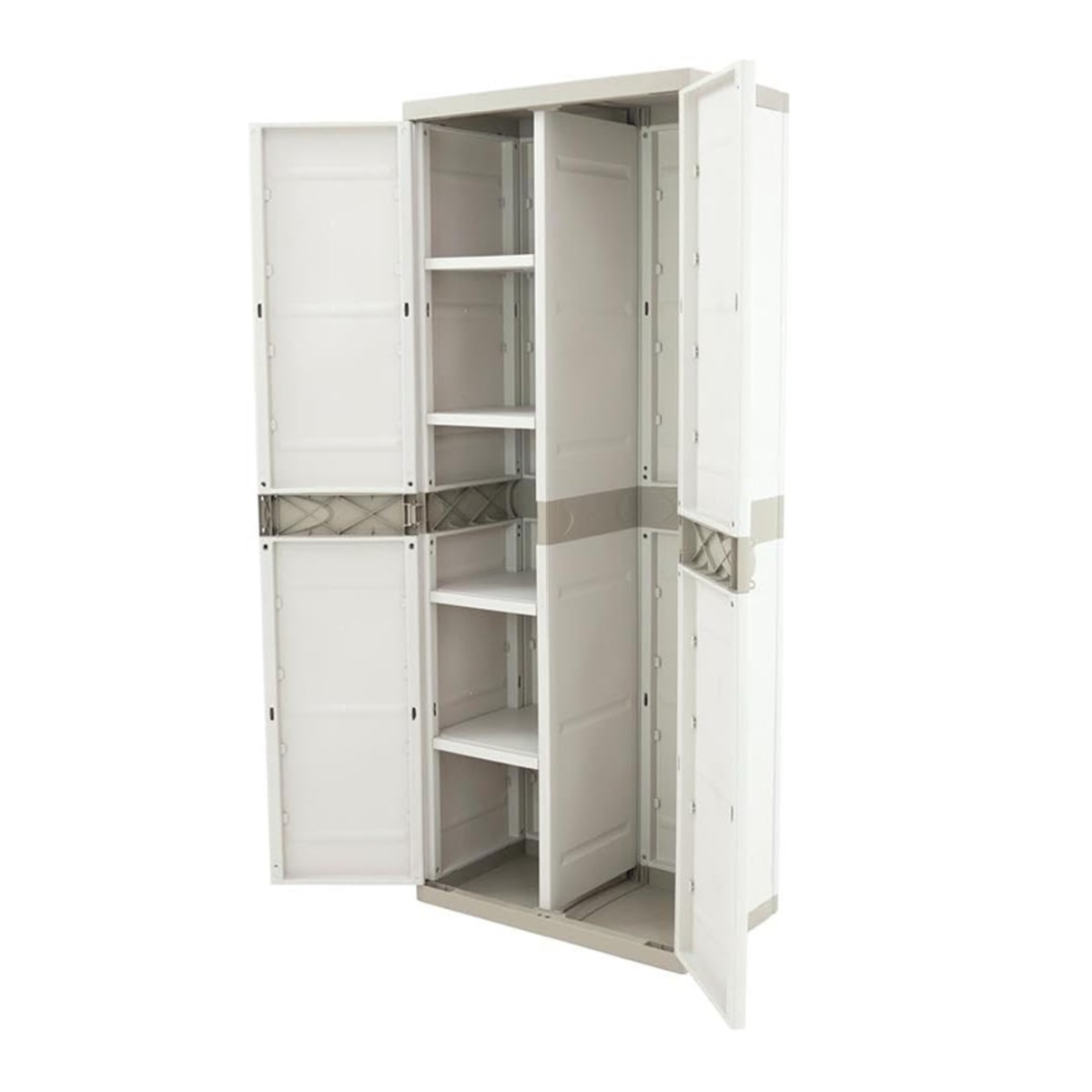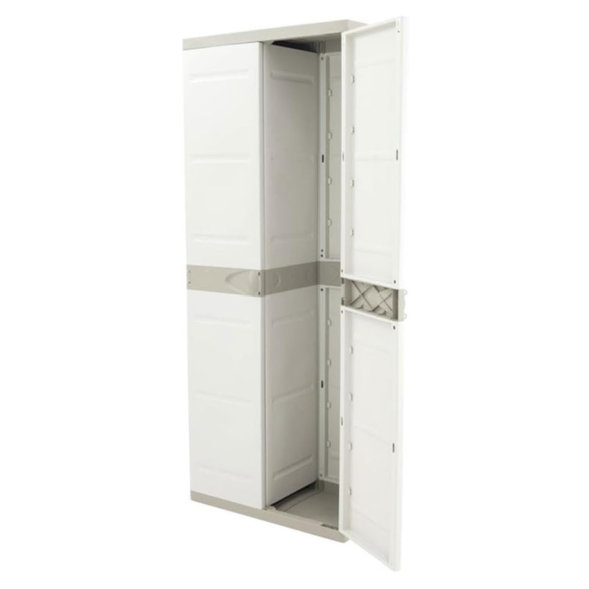 Armario de plástico para uso interior y exterior es una solución práctica para organizar objetos en el hogar, garajes, trasteros, terrazas o zonas de almacenamiento. Fabricado en plástico resistente, ofrece buena durabilidad y resistencia a la humedad, siendo adecuado para un uso diario. Su acabado en color beige neutro permite integrarlo fácilmente en distintos espacios. Dispone de dos puertas que facilitan el acceso y protegen el contenido, y cuenta con cuatro baldas regulables en altura para adaptar el espacio de almacenaje según las necesidades. Con unas medidas de 176 cm de alto, 70 cm de ancho y 41 cm de fondo, proporciona una buena capacidad ocupando poco espacio. Una opción funcional y versátil para mantener el orden de forma sencilla y eficiente.