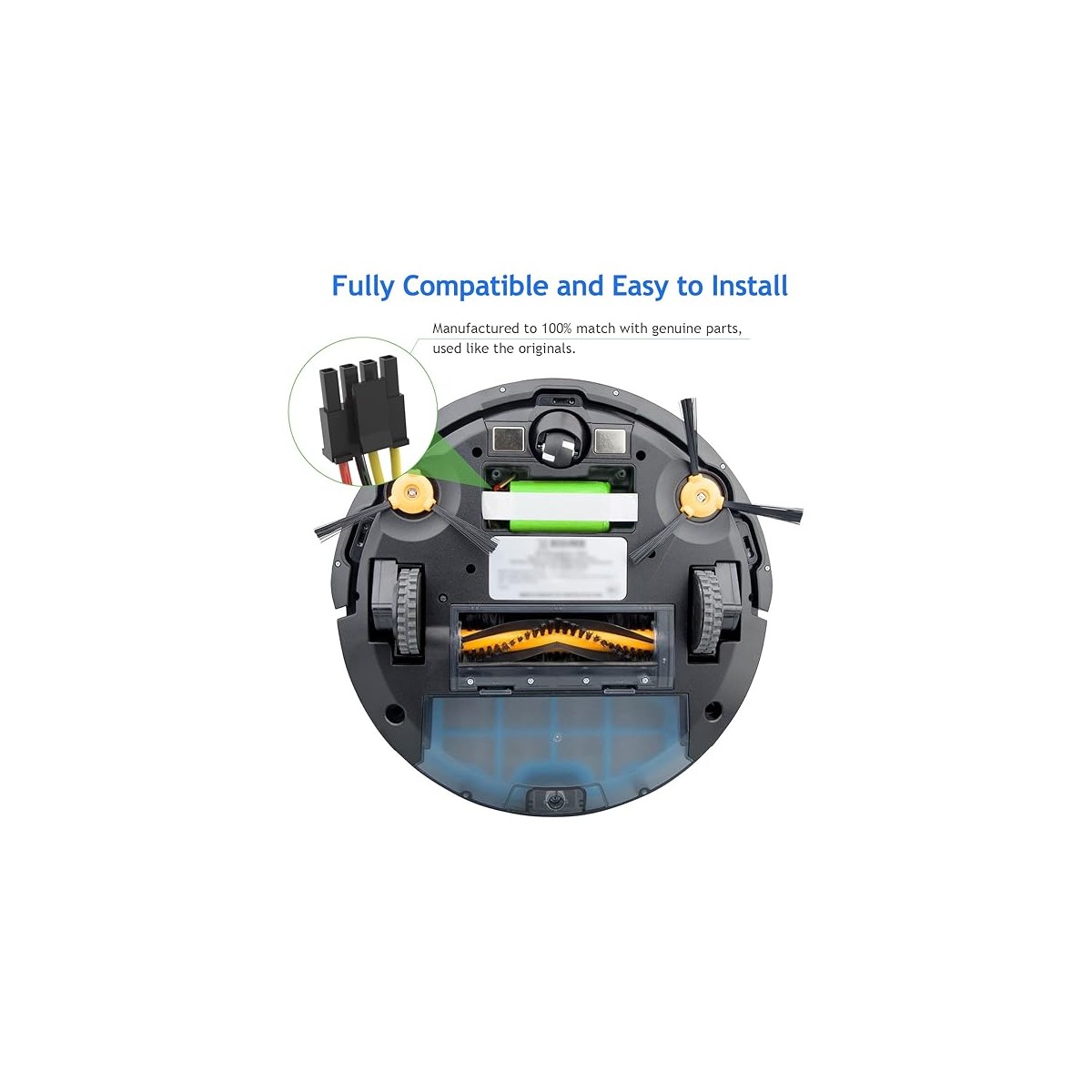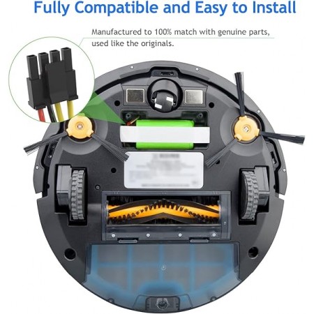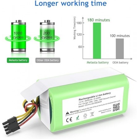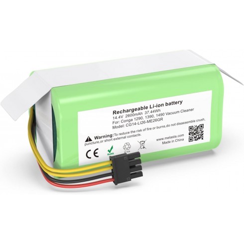 Batería Reemplazo Li-Ion 2600mAh de 14.4V para Aspiradoras Conga 1290, 1390, 1490, 1590 Esta batería de alta calidad está diseñada para los modelos 1290, 1390, 1490, 1590 de aspiradora robot Conga. A continuación proporcionamos detalles clave: Capacidad y Voltaje: La batería tiene una capacidad de 2600 mAh y funciona a 14.4V. Estos parámetros son idénticos a los de la batería original. Tamaño y Conector: La batería tiene el mismo tamaño que la original y se conecta sin problemas. Sus dimensiones son L72*W37*H37mm, y el conector tiene 4 pines y 4 cables. Tiempo de Funcionamiento: Proporciona un tiempo de funcionamiento prolongado de 1.5 a 3 horas, lo que es más potente que la batería original. Tecnología Avanzada: Permanece al 80% de su capacidad después de 1000 ciclos de carga. Seguridad y Fiabilidad: Cuenta con tecnología de PCB integrada para evitar daños por sobrecalentamiento, sobre carga y sobre descarga. Además, no tiene efecto memoria y su tasa de auto descarga es baja (1% por mes). Certificaciones: Está certificada por CE, RoHs, FCC, KC y UN38.8.