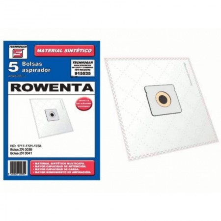 Bolsa aspirador sintética. Código Original Fabricante Tecnohogar: 915535 Unidades: 5 Marcas Adaptables: Carrefour, Moulinezx, Orbegozo, Rowenta, Hoover, entre otros. Adaptabilidad Aspiradores Carrefour Modelos: DVC 11, DVC 140, HVC 180, HVC12, VD8101A 02. Adaptabilidad Aspiradores Hoover Modelos: BRAVE, BV10011, BV20011, BV30011, BV71, H63, H64. Adaptabilidad Aspiradores Moulinez Modelos: ACCESSIMO, BOLSA VC 260E3, COMPACTEO, MINI SPACE, MINI SPACE, MO 182501. Adaptabilidad Aspiradores Orbegozo Modelos: AP 7004, AP7004, AP7007. Adaptabilidad Aspiradores Rowenta Modelos: BOLSA ZR 0039, BOLSA ZR 0041, CITYSPACERO2423, CITYSPACERO2441, CITYSPACERO2451, CITYSPACERO5253, RO COMPACTEO, RO 1717, RO 1721, RO 1733, RO 1735, RO 1767, ROCOMPACTEO1726, RO1726, RO1783COMPACTEO, RO2443, RO2611EA, RO2669, RO5227COMPACTEO, RO5227COMPACTEO, RO5253COMPACTEO, RO5285, RO5295COMPACTEO, SPACE RO 2123, SPACE RO 2145, VC 20 PE 3, VC 60 PE 3.