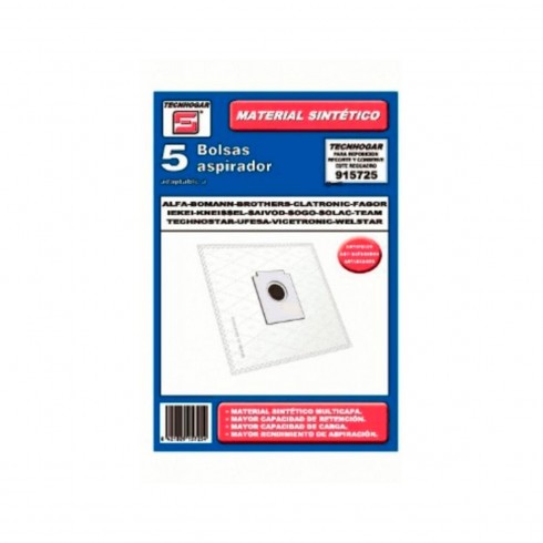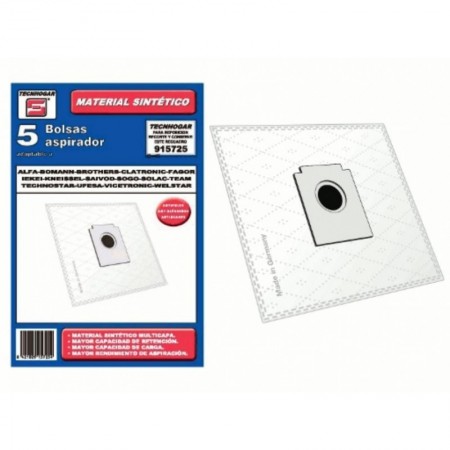 Bolsa aspirador sintética. Unidades: 5 bolsas. Código Original Fabricante Tecnohogar: 915725 Marcas Compatibles: AEG, ALFA, BLUESKY, BOMANN, BROTHERS, CLATRONIC, DILEM, DIRT DEVIL, FAGOR, GLENAN, IEKEI, KNEISSEL, SMC, SAIVOD, SOGO, SOLAC, TEAM, TECHNOSTAR, TERMOZETA, TRISTAR, UFESA, UPSUS, WELSTAR.