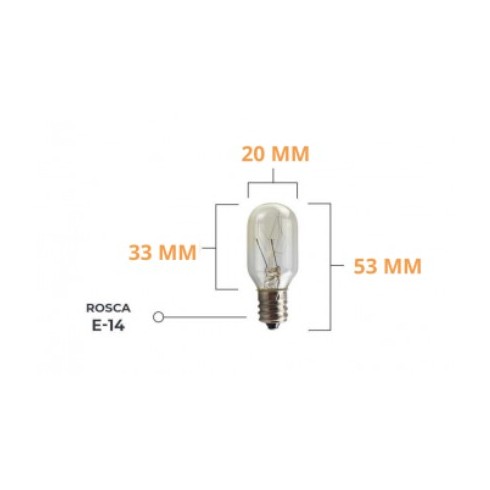 Bombilla de rosca E-14 de 15W de potencia y 20x53mm para máquinas de coser y todo tipo de aparatos aptos para este sistema de rosca. Las medidas de la bombilla que se indican son aproximadas.