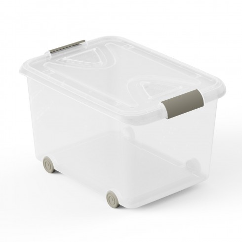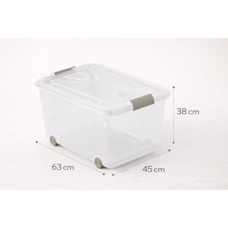 Caja de almacenaje de plástico transparente con ruedas y tapa, Capacidad 70 L, Medidas: 63x45x38 cm