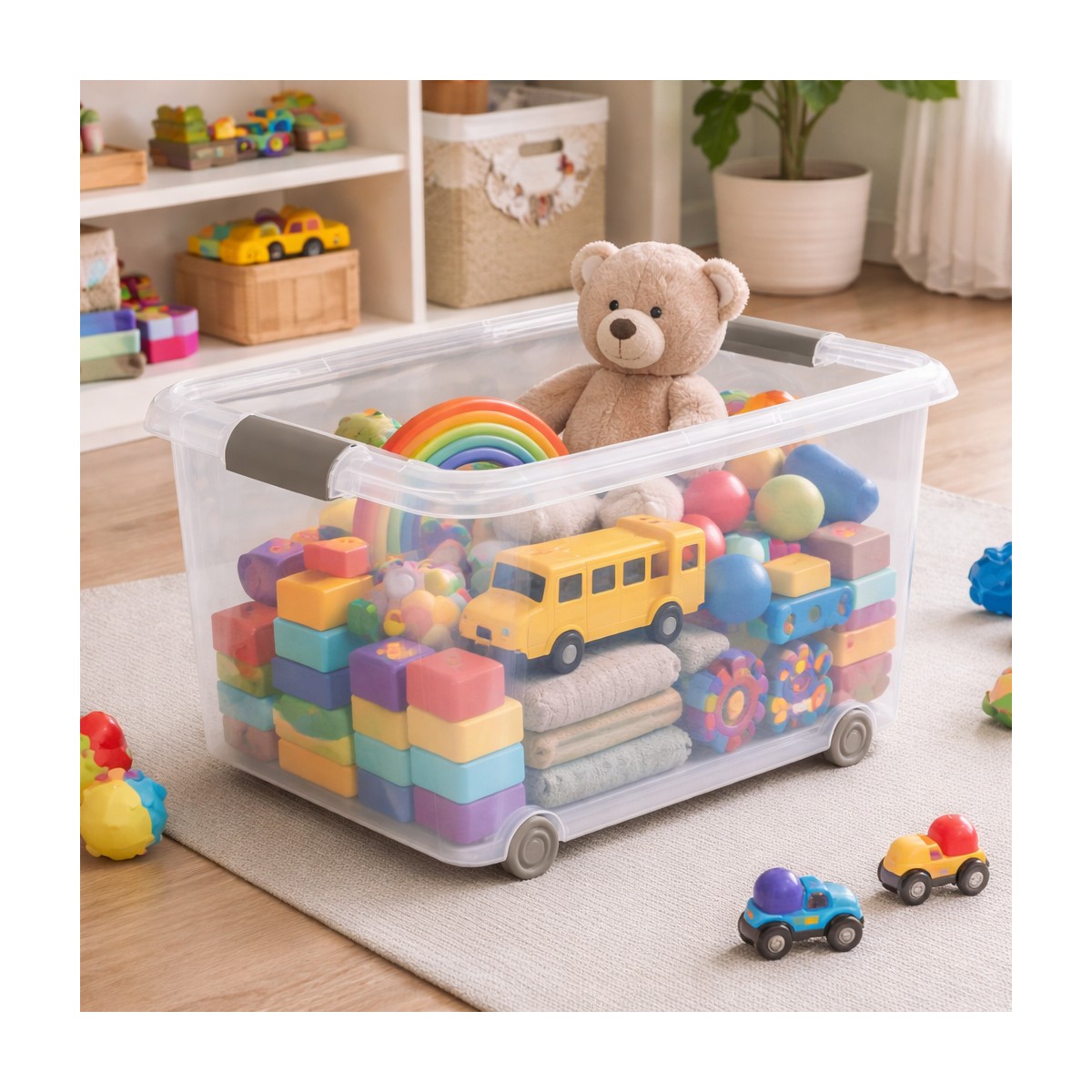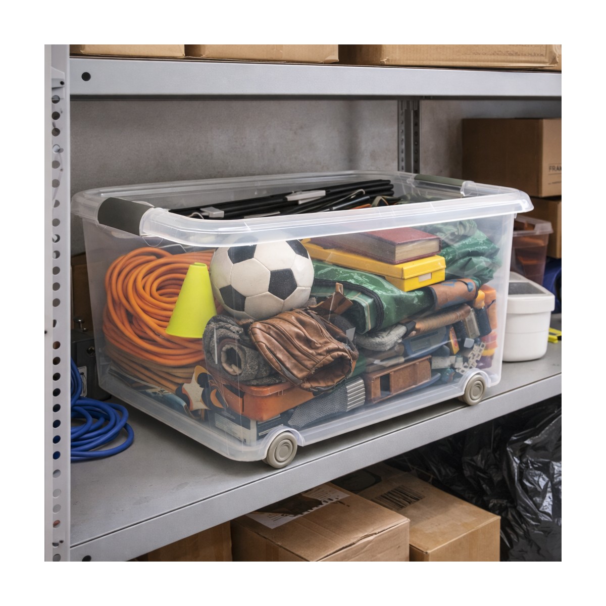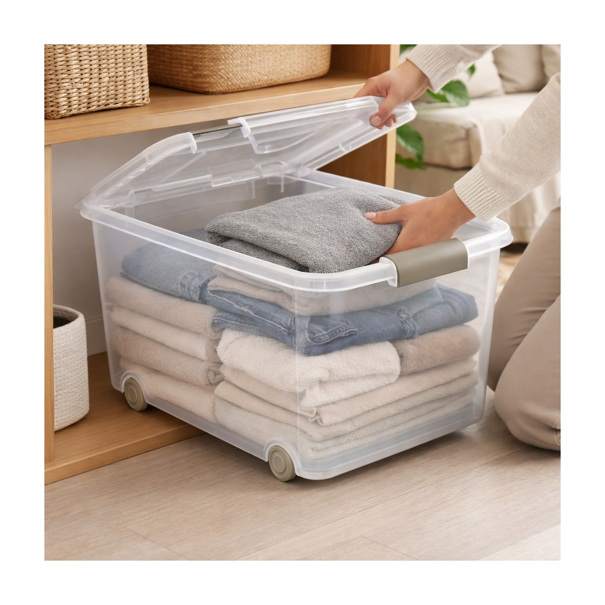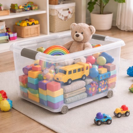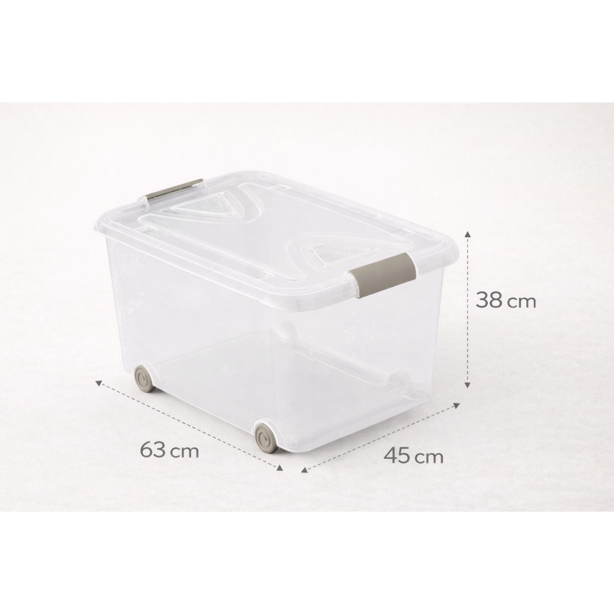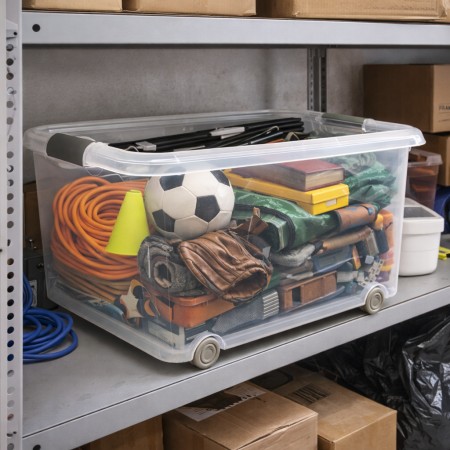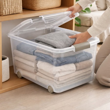 Caja de almacenaje de plástico transparente con capacidad de 70 litros, ideal para organizar y proteger todo tipo de objetos en el hogar, garaje, trastero u oficina. Su diseño transparente permite identificar el contenido de un vistazo sin necesidad de abrir la tapa. Incorpora tapa resistente para mantener los artículos protegidos del polvo y la suciedad, así como ruedas integradas que facilitan el desplazamiento incluso cuando la caja está llena. Fabricada en plástico duradero y ligero, es una solución práctica para el almacenamiento diario. Medidas aproximadas: 63x45x38 cm. Perfecta para guardar ropa, juguetes, herramientas, documentos u otros enseres de forma ordenada y accesible.