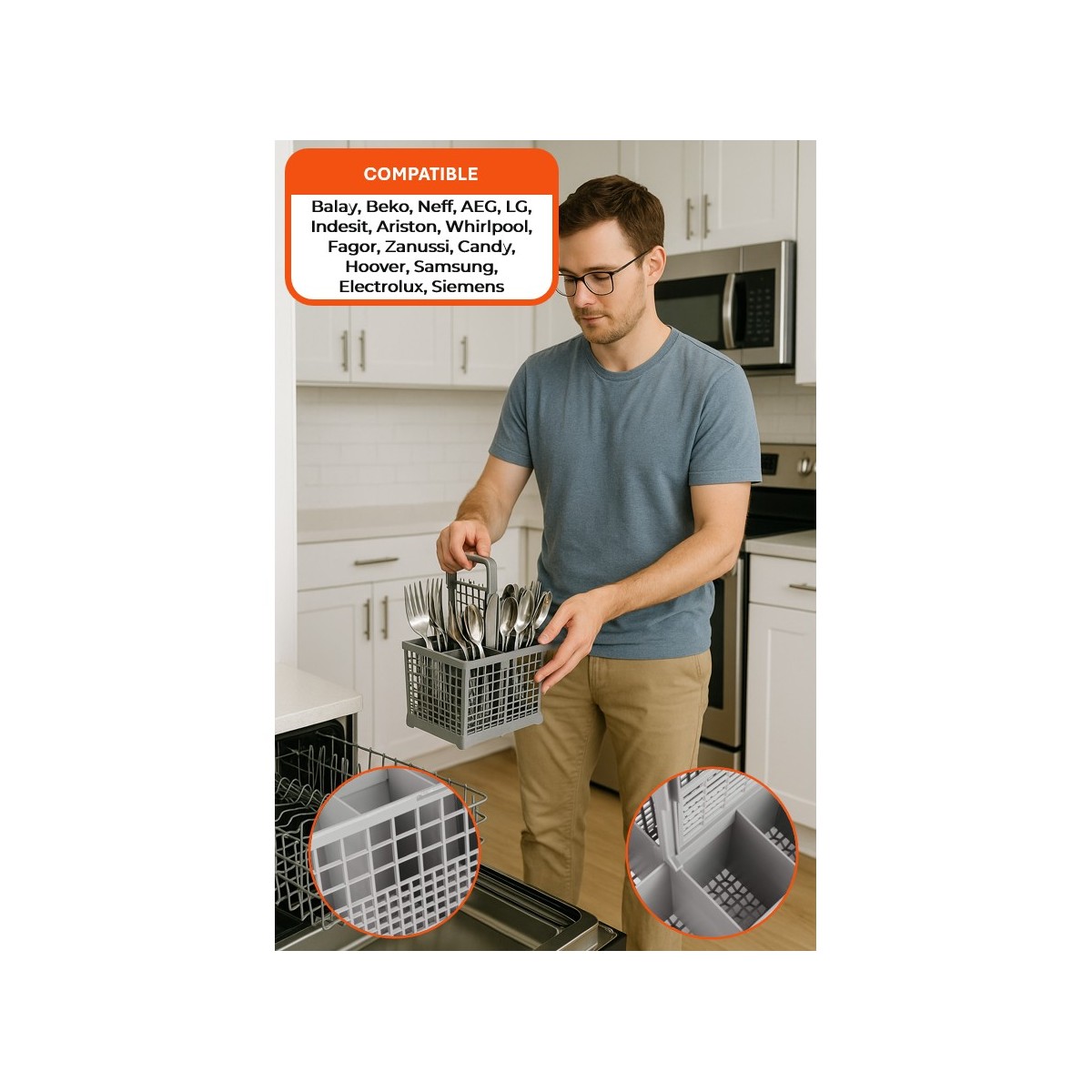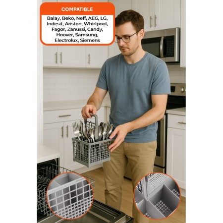 Codigo original: 263564-134576-621320. Cesto cubiertos para lavavajillas multimarca. Medidas: 240x135x123 mm (largo x ancho x alto). Compatible con: Bosch, Balay, Siemens, Neff, AEG, Electrolux, Indesit, Ariston, Whirlpool, Fagor, Zanussi, Candy, Hoover, Samsung, LG, Beko, entre otras. 3VE4525SR BAV21100 LV529R SN5BY01 3VE4526 BAV2110000 LYV11000 SN5BY20 3VE4527 BAV2110B00 LYV1100000 SN5BY21 3VE490Z BAV2111000 LYV12100 SN5BY51 3VE492A BAV21300 LYV1210000 SN5BY60 3VE494A BAV2130000 LYV21000 SN5BY61 3VE4950 BAV21410 LYV2100000 SN5BYA4EU 3VE4952 BAV2141000 LYV21100 SN5BYN0 3VE498Z BAV2141V00 LYV2110000 SN5BYN2 3VE4997 BAV2145000 LYV2111000 SN5BYN6 3VE499A BAV21500 LYV2130000 V4201V00 3VEPC2TCE BAV2150000 LYV2131000 V420300 3VEWH2TRA BAV21510 LYV2135000 V421200 3VI440A BAV2151000 LYV2140000 V421300 3VI4516 BAV2151V00 LYV21410 V4213V00 3VI4517 BAV2155000. Mirar modelos compatibles en las fotos del producto.