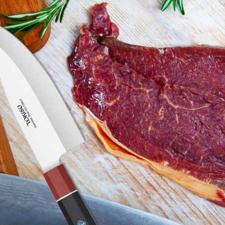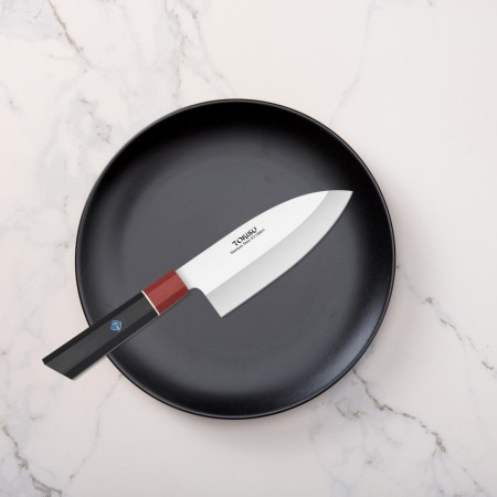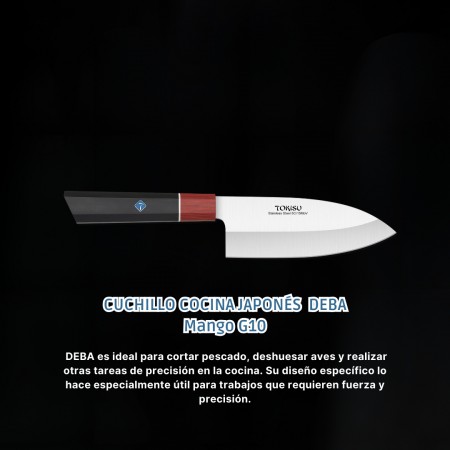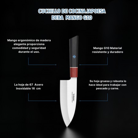 El DEBA es un cuchillo tradicional japonés utilizado principalmente para tareas de fileteado y deshuesado. Su hoja gruesa y robusta lo hace ideal para trabajar con pescado y carne. Material de la Hoja: La hoja está compuesta por 67 capas de acero inoxidable. Esta construcción multicapa proporciona una excelente resistencia, durabilidad y retención del filo. El acero inoxidable es resistente a la corrosión y fácil de mantener. Longitud de la Hoja: El cuchillo tiene una longitud de hoja de 16 cm. Esta longitud es adecuada para tareas específicas y permite un control preciso. Mango G10: El mango está hecho de G10, un material compuesto de fibra de vidrio y resina epoxi. Es resistente, duradero y proporciona un agarre cómodo incluso cuando está mojado. Uso Recomendado: El DEBA es ideal para cortar pescado, deshuesar aves y realizar otras tareas de precisión en la cocina. Su diseño específico lo hace especialmente útil para trabajos que requieren fuerza y precisión. En resumen, el Cuchillo Cocina Profesional TOKYSU DEBA combina la artesanía japonesa con materiales de alta calidad para ofrecer una herramienta confiable y versátil en la cocina.