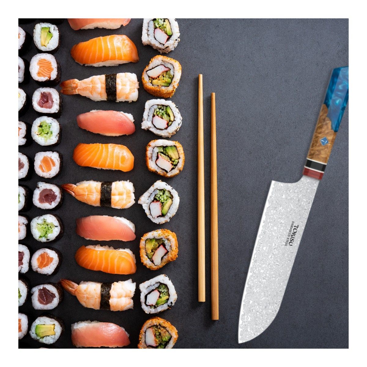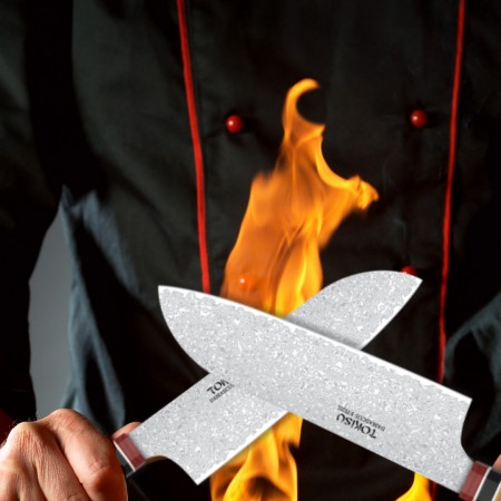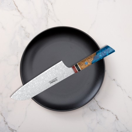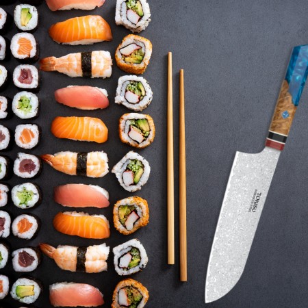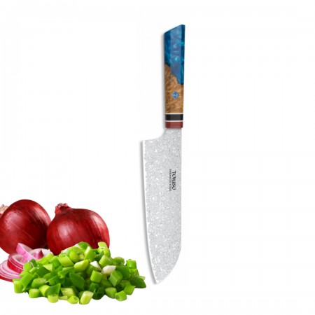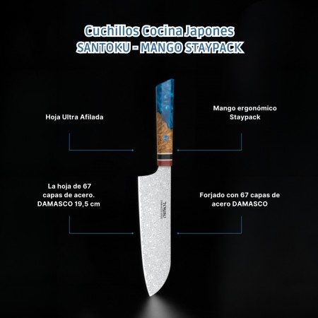 Descubre la precisión de la cocina japonesa con el cuchillo SANTOKU de TOKYSU, forjado con 67 capas de acero DAMASCO para una resistencia y durabilidad excepcionales. Este cuchillo profesional de 19,5 cm es la herramienta perfecta para chefs y entusiastas culinarios que buscan calidad y eficiencia en cada corte. Características Destacadas: Hoja Ultra Afilada: Cada cuchillo es afilado a mano para garantizar cortes precisos y finos, ideales para preparar sushi, verduras y carnes. Mango Staypack: Diseñado ergonómicamente para un agarre cómodo y seguro, reduciendo la fatiga durante el uso prolongado. Acero DAMASCO: Conocido por su belleza y resistencia, el acero DAMASCO proporciona una hoja robusta que mantiene su filo por más tiempo. Versatilidad: Perfecto para una variedad de tareas en la cocina, desde picar y rebanar hasta trocear y deshuesar. Beneficios del Producto: Durabilidad: Construido para soportar el uso diario en entornos de cocina exigentes. Estética Elegante: El patrón único del acero DAMASCO no solo es funcional sino también una obra de arte en tu cocina. Fácil de Mantener: Con cuidado adecuado, este cuchillo será tu compañero de cocina durante años. Incluye: 1 x Cuchillo de Cocina Profesional TOKYSU SANTOKU Instrucciones de cuidado y mantenimiento Garantía de satisfacción ¡Haz que cada corte cuente con el Cuchillo de Cocina Profesional TOKYSU SANTOKU!