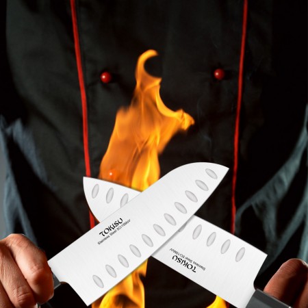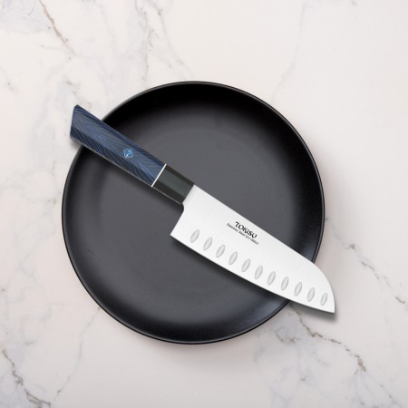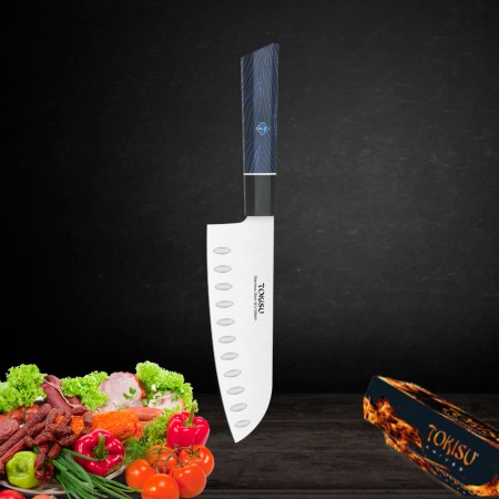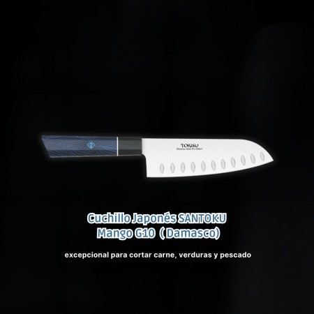 El cuchillo Santoku es un cuchillo práctico con una hoja de 17 cm de largo. Su diseño está pensado para una variedad de usos y aplicaciones profesionales, lo que lo convierte en un cuchillo verdaderamente utilitario. La hoja del cuchillo está hecha de acero inoxidable alemán con alto contenido de carbono (5cr15mov, SIN Damasco). Presenta una dureza Rockwell de 56-58, lo que garantiza cortes precisos, durabilidad y resistencia a la suciedad. El mango es conocido por su maniobrabilidad, comodidad, resistencia y estabilidad. Está hecho de madera elegante con protección para los dedos integrada, lo que permite un trabajo seguro y rápido. La hoja ultra afilada está hecha de acero inoxidable alemán de alta calidad con 16-18% de cromo y 0,6-0,75% de carbono. Es resistente a la oxidación y proporciona una superficie lisa y brillante, ideal para cortar carne, frutas y verduras sin esfuerzo. El mango G10 es mucho más cómodo y sólido que el mango de madera. Este cuchillo japonés Santoku profesional tiene un diseño ergonómico y un equilibrio excepcional para cortar carne, verduras y pescado