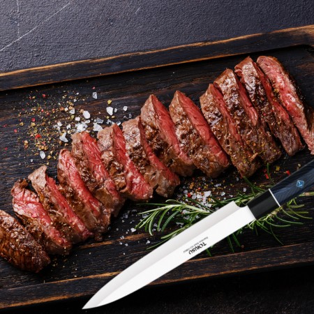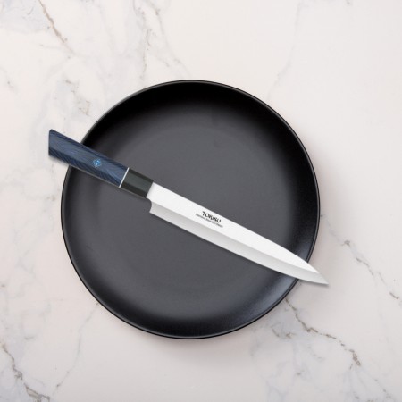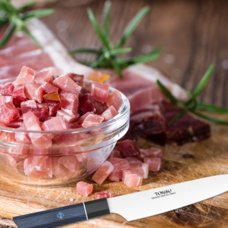 El Cuchillo Cocina Profesional TOKYSU es una joya culinaria que combina la tradición japonesa con la precisión moderna. Hoja de Acero Inoxidable de 67 Capas: La hoja está compuesta por 67 capas de acero inoxidable, lo que le otorga una resistencia excepcional y un patrón visual atractivo. El proceso de forjado y plegado crea una hoja duradera y afilada. Tamaño Small Gyuto: Con una longitud de 19,5 cm, este cuchillo es versátil y manejable. El diseño Gyuto es ideal para tareas como cortar en rodajas, picar y cortar en dados. Su ligera curvatura permite un movimiento suave y preciso. Mango G10 Damasco: El mango está hecho de G10, un material compuesto de resina y fibra de vidrio. Es resistente al agua, duradero y proporciona un agarre cómodo. El patrón Damasco en el mango añade un toque estético. En resumen, el Cuchillo Cocina Profesional TOKYSU es una herramienta de alta calidad que combina belleza y funcionalidad. Perfecto para chefs apasionados que buscan la excelencia en la cocina japonesa