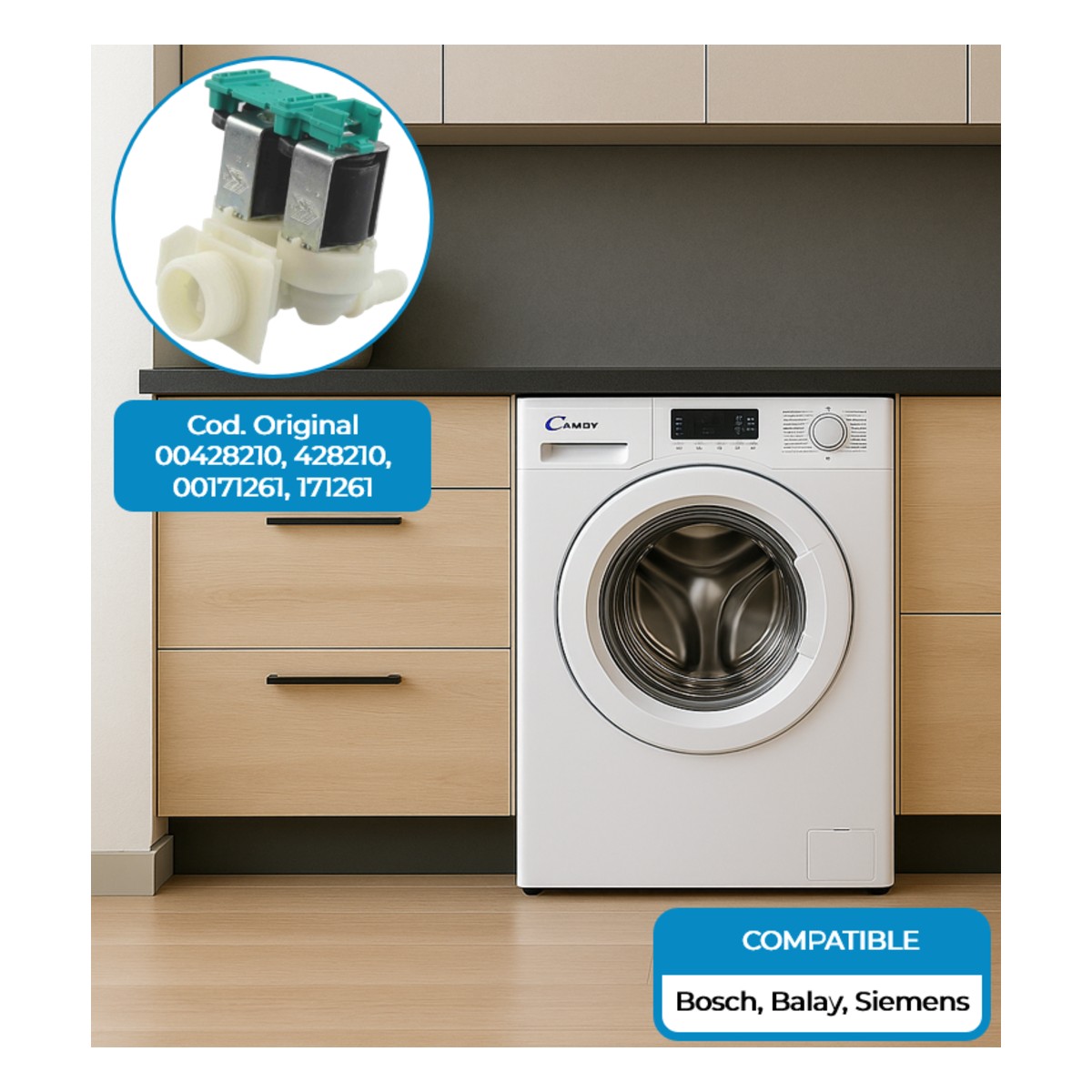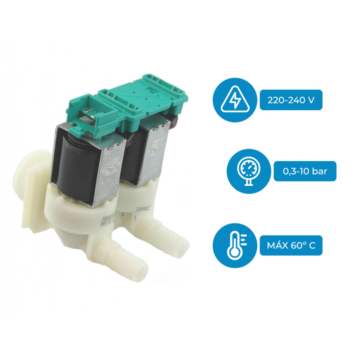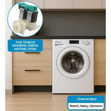 Electroválvula lavadora Balay, Bosch, Siemens. Vías: 2 Entrada Rosca: 3/4′ Salida: 180º Salida diámetro: Ø 11 mm Brida Conector a la derecha. Código Original Fabricante: 00171261, 00428210 10031360 Marcas Compatibles: BOSCH, BALAY, LYNX, NEFF, SIEMENS. Adaptabilidad Lavadoras Modelos: WAA22170FF, WAA24160BY, WAA24170FF, WAA24171FF, WAA24171GB, WAA28260FF, WAB24060GB, WAB24210FF, WAB28210FF, WAB28211FF, WAE20160FF, WAE20161FF, WAE20162FF, WAE20163FF, WAE20360FF, WAE20360OE, WAE20460FF, WAE24060FF, WAE24062FF, WAE24160FF, WAE24161FF, WAE24162FF, WAE24163FF23, WAE24165FF, WAE24260FF, WAE24260GB, WAE24261FF, WAE24262FF, WAE24263FF, WAE2426XFF, WAE24270FF, WAE24271FF, WAE24272FF, WAE24361FF, WAE24362FF, WAE24363FF, WAE24460AU, WAE24460FF, WAE24460PL, WAE24462FF, WAE24470FF, WAE24471FF, WAE24472FF, WAE244A0FF, WAE28160FF, WAE28161FF, WAE28162FF, WAE28210FF, WAE28217FF, WAE28260FF, WAE28261FF, WAE2826XFF, WAE28320FF, WAE28361FF, WAE28362FF, WAE28364FF, WAE28460FF, WAE28461FF, WAE28463FF, WAE28464FF, WAE28465FF, WAE32420FF, WAN28220FF, WFD2460NL, WFH1660FF, WFH2060FF, WFH2062FF, WFH2460FF, WFH2461FF, WFL1000II, WFL1000IT, WFL1600FF, WFL1600FR, WFL1860FF, WFL1860FR, WFL2060FR, WFL2062FF, WFL2062FR, WFL2460FF, WFL2462FF, WFL2462FR, WFO1660FE, WFO1860, WFO2060FE, WFO2060FF, WFO2061FF, WFO2062FF, WFO2062FR, WFO2460FF, WFO2460FR, WFO2461, WFO2461FF, WFO2461FR, WFO2462FF, WFO2462FR, WFO2862FF, WFR2460FF, WFX2460FR, WFX3260FF.