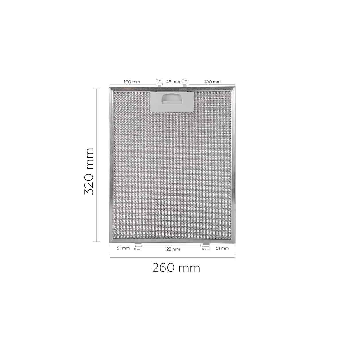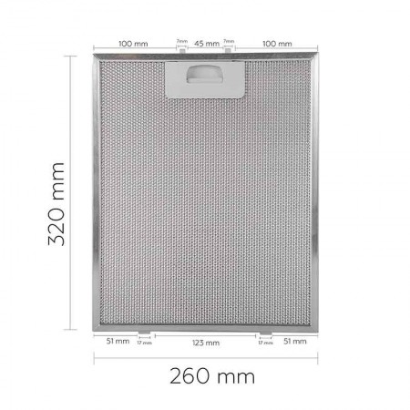Filtro campana extractora Multimarca. Características: Medidas: 320 x 260 mm Distancia entre las patillas de arriba: 45 mm Distancia a cada lado de las patillas: 100 mm Longitud las patillas de arriba: 7 mm Distancia entre las patillas de abajo: 123 mm Distancia a cada lado de las patillas traseras: 51 mm Longitud de la patilla trasera: 17 mm OJO: Revisar la imagen con las medidas y distancias entre patillas.