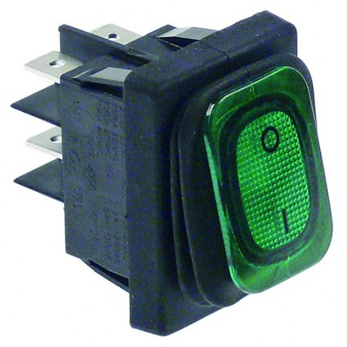 Adaptable a modelos: Amatis, Bartscher, Blanco, Bourgeat, Cookmax, Enofrigo, Faba, Forcar, Friginox, Hendi, Horeca-Select, Makro-Professional, MCC-Trading-International, Metro-Professional, Morice, Ningbo-Rotor, Rieber, Roller-Grill, Telme, Yindu Detalles: Dimensión de instalación 30x22mm color verde función 2NO tensión 250 V conexión Enchufe plano de 6,3 mm tipo con cuello de goma símbolo 0-I Capacidad de conmutación 20 A clase de protección IP65 Forma clave rectangular iluminado iluminado con funda protectora - Temperatura ambiente máx. 125/55 ° C