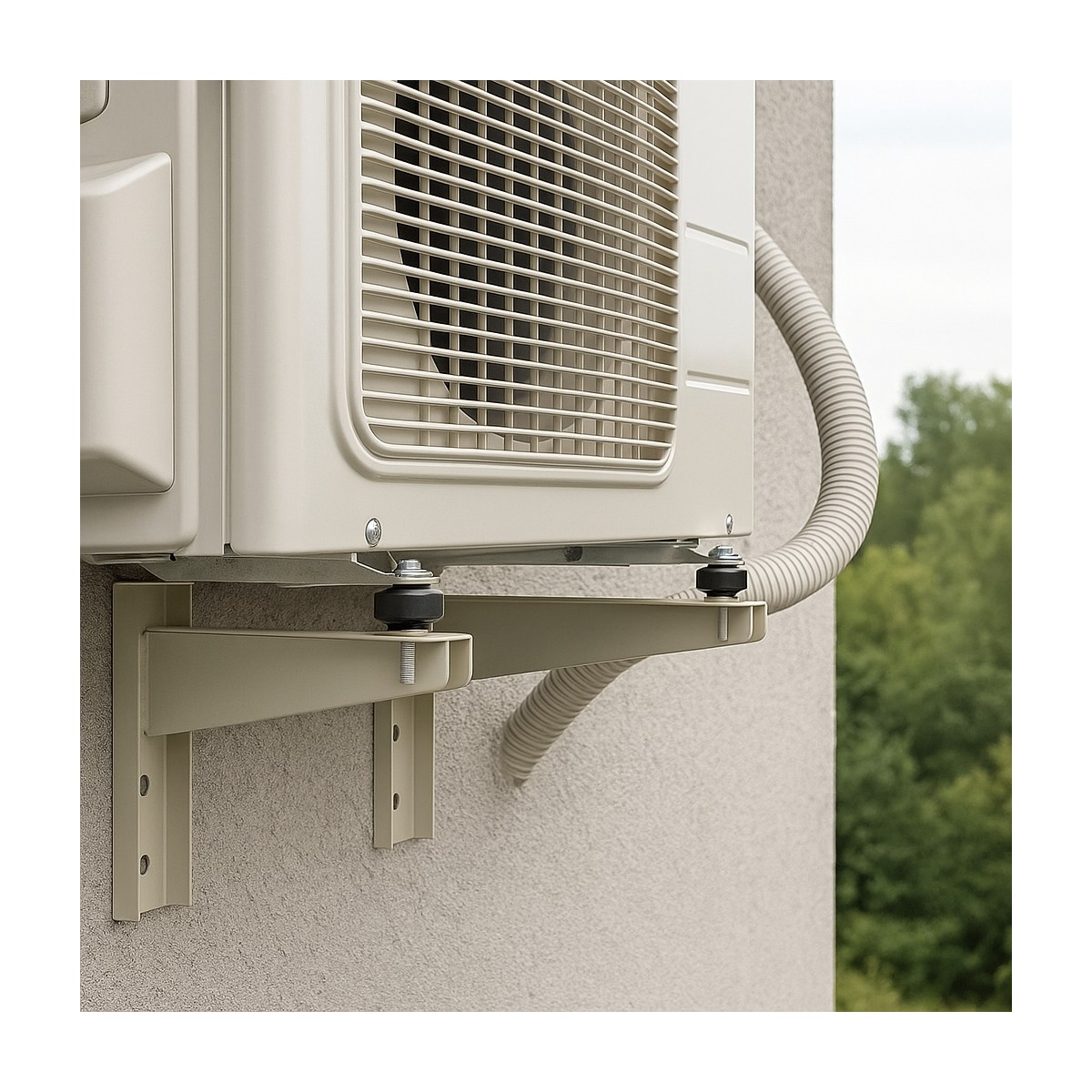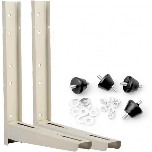 Soporte de pared para unidad exterior de aire acondicionado con dimensiones de 450 x 450 x 50 mm y espesor de 1,5 mm, fabricado en acero de alta calidad con estructura soldada que garantiza resistencia y durabilidad. Su diseño facilita una instalación rápida y segura, con materiales resistentes a la intemperie que prolongan su vida útil. Compatible con la mayoría de modelos del mercado, ofrece una solución robusta y versátil para instalaciones exteriores.