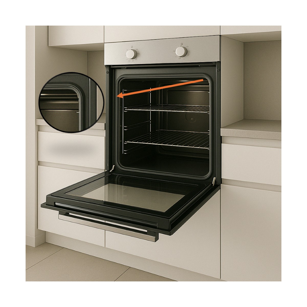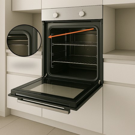 Esta junta de goma con cuatro ganchos en las esquinas y medidas 400x290mm garantiza un cierre hermético, ayudando a conservar el calor y mejorar la eficiencia del horno.