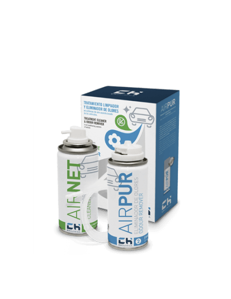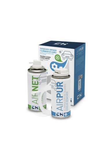 KIT AIRNET AIRPUR auto (Kit 2 aerosoles) limpia y elimina los malos olores del aire acondicionado de su vehículo en solo dos pasos. Elimina por contacto las acumulaciones de suciedad producidas por el paso del aire, microorganismos, nicotina, polvo, etc. y mantiene el circuito y el habitáculo libre de olores desagradables.
