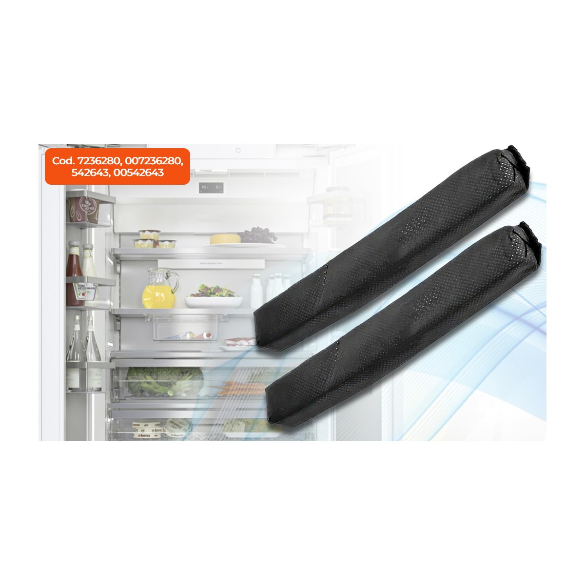 Mantén tu frigorífico siempre fresco y libre de olores con este kit de 2 filtros de carbón activo compatibles con frigoríficos y congeladores Miele. Fabricados con carbón activo vegetal de alta eficacia, estos filtros absorben olores y contaminantes. Cada filtro tiene unas medidas de 198x26x22 mm y sustituye directamente a los códigos originales Miele 07236280, 7236280, 00542643 y 542643. Son aptos para múltiples modelos, incluyendo Miele K12000, K14000, K30000, K9000, KD12000, KD20000, KDN, KF, KFN y KTN. Se instalan fácilmente en el soporte especial situado en el borde posterior de uno de los estantes de cristal y deben sustituirse cada 6 meses para un rendimiento óptimo.