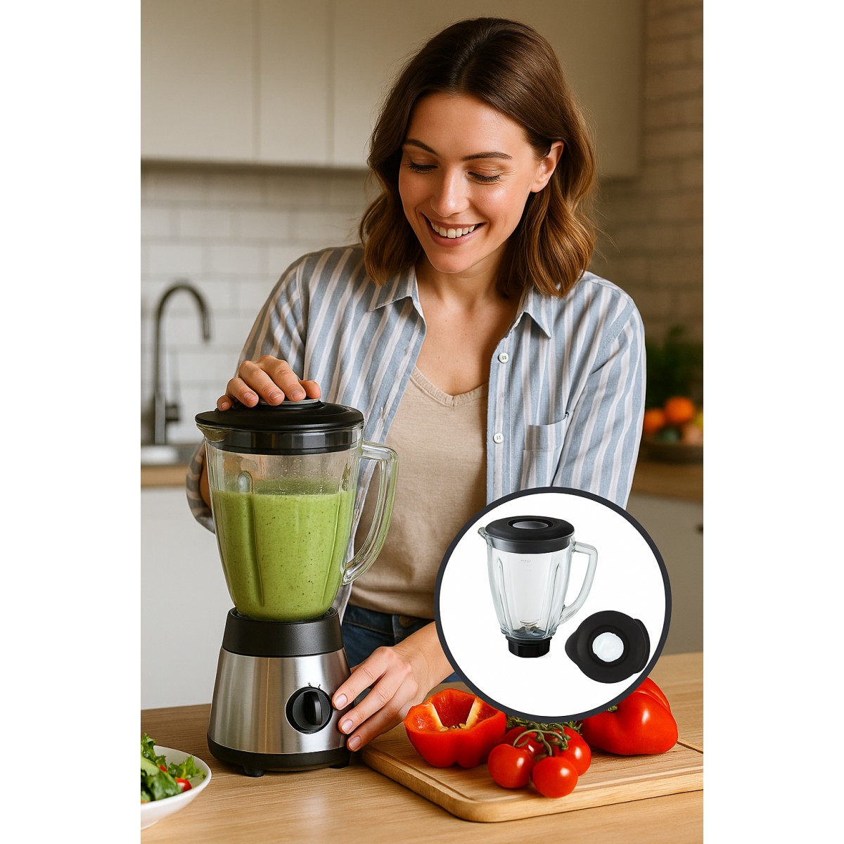 Kit de repuesto que incluye una jarra de vidrio redonda y una tapa con tapón desmontable, ambos compatibles con los modelos 0004655ESP-050 y BPST02-B00-050. Ideal para reemplazar piezas dañadas o extraviadas, este kit ofrece una solución completa, duradera y fácil de instalar. Calidad garantizada y compatibilidad precisa para seguir disfrutando de tus preparaciones favoritas sin interrupciones.