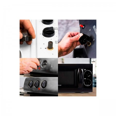 Mando Universal para Horno, Placa Cocina o microondas. Incluye 3 ejes para adaptar al selector de la cocina de gas o del horno. Todas las Marcas: Universal. Diámetro total: 4 cm Diámetros ejes corto: 6 mm Diámetro eje largo: 8 mm Paquete: 4 unidades.