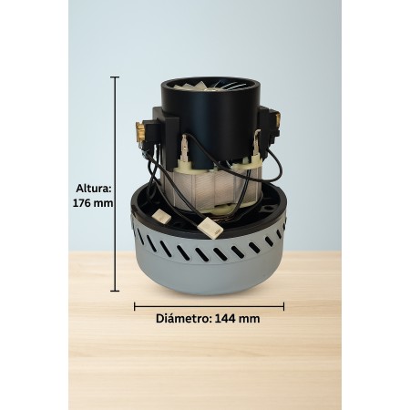 Motor aspirador universal Recamania de 1200W y 230V con tecnología bistadio, diseñado para aspiradores de sólidos y líquidos. Su sistema de fijación de 4 orificios asegura una instalación estable y compatible con distintos modelos. Fabricado con materiales de alta calidad para ofrecer mayor potencia, durabilidad y seguridad. Medidas: altura 176 mm, diámetro 144 mm.