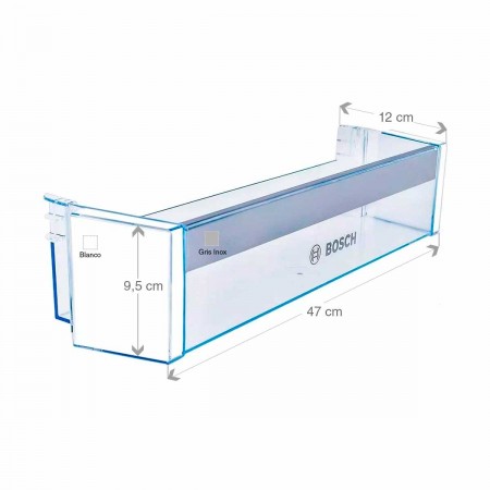 Estante botellero frigorífico 00744473. Compatible con Bosch. Medidas: 470 x 95 x 120 mm (Ancho x Alto x Fondo) Detalles Color Frontal : Transparente y Embellecedor Gris Inox. Serigrafia y logotipo Original . Detalle Color Lateral: Blanco. Repuesto Original para Frigorífico compatible con Bosch. Código Original Fabricante: 00744473 . Adaptabilidad Modelos: GN34XL30G/01, KGN36XL30/04, KGN39XI32/03, KGN39XI45/18, KGN34XL30G/03, KGN36XL30/07, KGN39XI32/06, KGN39XI45/20, KGN34XL32G/01, KGN36XL30/09, KGN39XI32/08, KGN39XI45/22, KGN34XL32G/03, KGN36XL30G/01, KGN39XI32/11, KGN39XI45/24, KGN34XL32G/05, KGN36XL30G/03, KGN39XI33/01, KGN39XI45/25, KGN34XW30G/01, KGN36XL30G/08, KGN39XI34/01, KGN39XL30/01, KGN34XW30G/03, KGN36XL32/01, KGN39XI34/18, KGN39XL30/02, KGN34XW32G/01, KGN36XL32/03, KGN39XI34/20, KGN39XL30/04, KGN34XW32G/03, KGN36XL32/05, KGN39XI34/25, KGN39XL30/07, KGN34XW32G/05, KGN36XL41/01, KGN39XI34/27, KGN39XL30/09, KGN36XI30/01, KGN36XL41/04, KGN39XI35/01, KGN39XL32/01, KGN36XI30/02, KGN36XL41/17, KGN39XI35/18, KGN39XL32/18, KGN36XI30/04, KGN36XL41/22, KGN39XI35/20, KGN39XL32/20, KGN36XI30/07, KGN36XW30/01, KGN39XI35/25, KGN39XL32/25, KGN36XI30/09, KGN36XW30/02, KGN39XI35/27, KGN39XL32/27, KGN36XI30/12, KGN36XW30/04, KGN39XI36/01, KGN39XL41/01, KGN36XI30Z/02, KGN36XW30/07, KGN39XI36/18, KGN39XL41/18, KGN36XI30Z/04, KGN36XW30/09, KGN39XI36/20, KGN39XL41/20, KGN36XI30Z/07, KGN36XW30G/01, KGN39XI36/25, KGN39XL41/22, KGN36XI30Z/09, KGN36XW30G/03, KGN39XI36/27, KGN39XW30/01, KGN36XI32/01, KGN36XW30G/08, KGN39XI40/01, KGN39XW30/02, KGN36XI32/03, KGN36XW31/01, KGN39XI40/02, KGN39XW30/04, KGN36XI32/05, KGN36XW31/03, KGN39XI40/03, KGN39XW30/07, KGN36XI40/01, KGN36XW31/05, KGN39XI40/05, KGN39XW30/09, KGN36XI40/02, KGN36YL30/01, KGN39XI40/07, KGN39XW32/01, KGN36XI40/03, KGN39XB30/02, KGN39XI40/10, KGN39XW32/18, KGN36XI40/04, KGN39XB32/01, KGN39XI40/12, KGN39XW32/20, KGN36XI40/05, KGN39XB32/18, KGN39XI41/05, KGN39XW32/25, KGN36XI40/07, KGN39XC30/01, KGN39XI