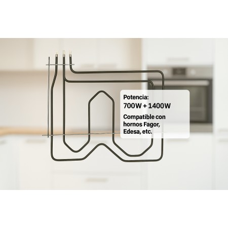 Resistencia para horno Fagor, Edesa, entre otros. Potencia.: 700W + 1400W Adaptabilidad Hornos FAGOR Modelos: 1H-125, 1H-413B, 1H-414N, 1H-425, 1H-425B, 1H413B901013530, 1H414N901013585, 2H125N, EPO, 2H-114N, 2H-125I, 2H-413, I, 2H-414N, 2H-425N, 2H125N, 2H414N901013433, 2H425N901013479, 2HS413B, 3H-425X, 3H435X, 901011612HE411B, 901012489H110B, 901012568H113B1, 901012666H126B, 9010134332H414N, 9010134792H425N, 9010135301H413B, 9010135851H414N, 901014593H196X, H-113B-1, H-132B, H-410B, H-426B, H110B, H110B1901012522, H110B901012489, H110M1901012513, H110M901012470, H111B1901010533, H111B901010052, H111M1901010524, H111M901010043, H113B1901012568, H113B901010123, H113M1901012559, H113M901010061, H114B1901012586, H114B901010187, H114M1901012577, H114M901010132, H125B901010301, H125M901010230, H126B, H126B1901012666, H126B901010329, H126B901012666, H126EPOCA901010338, H126M1901012657, H126M901010310, H132B901012602, H132M901012595, H185B, H185X, H196X, H196X901014593, H2-1401B, H410B1901012693, H410B901012504, H410M1901012684, H410M901012498, H411B-1, H411B1901010631, H411B901010365, H411M1901010622, H411M901010356, H412B901010409, H412M901010374, H413B1901012755, H413B901010472, H413M1901012746, H413M901010436, H414B1901012773, H414B901010926, H414M1901012764, H414M901010855, H425B1901012835, H425B901011603, H425M1901012826, H425M901011578, H426, EPOCA, H426B1901012853, H426B901011685, H426EPOCA1901012862, H426EPOCA901011694, H426M1901012844, H426M901011667, H432B901012791, H432M901012782, H434B1901011587, H434B901012817, H434M901012808, H44DB901010070, H44DM901010089, HA411EB901110024, HA411EM901110015, HA414EB901110042, HA414EM901110033, HA426EB1901110060, HE-411B, HE-412, HE-412B, HE-426M, HE101901011836, HE111901011337, HE111B901011783, HE112901011346, HE112B901011701, HE113901012274, HE113B901012283, HE114901011024, HE114B901011710, HE11B901011676, HE11N901011747, HE123B901011042, HE123G901011051, HE123M901011033, HE125B901011079, HE125G901011088, HE125M90101106