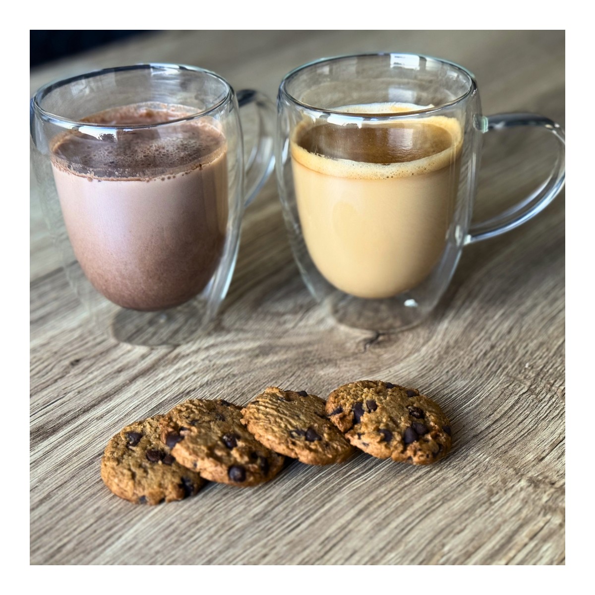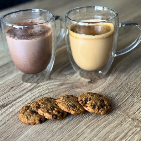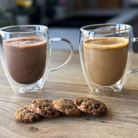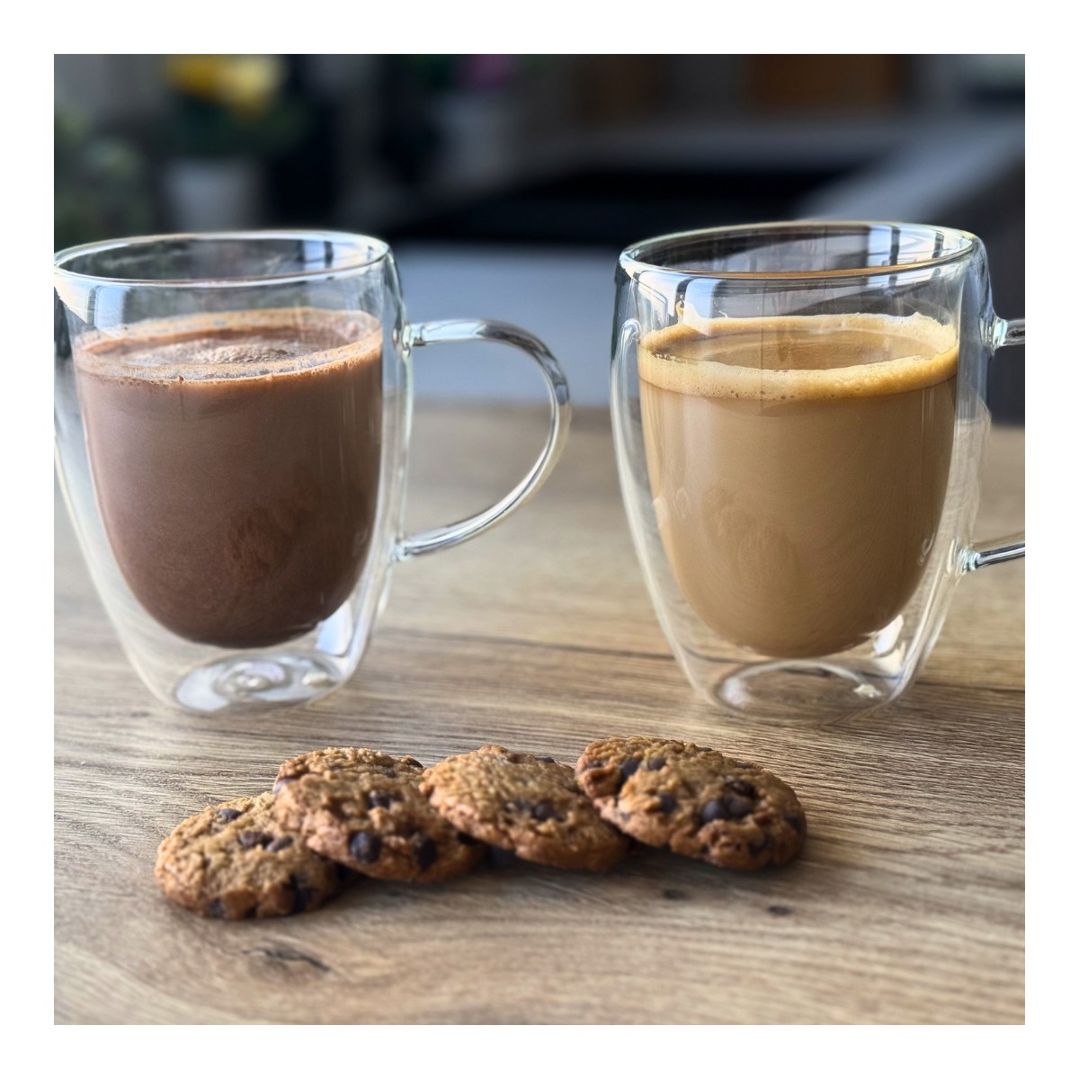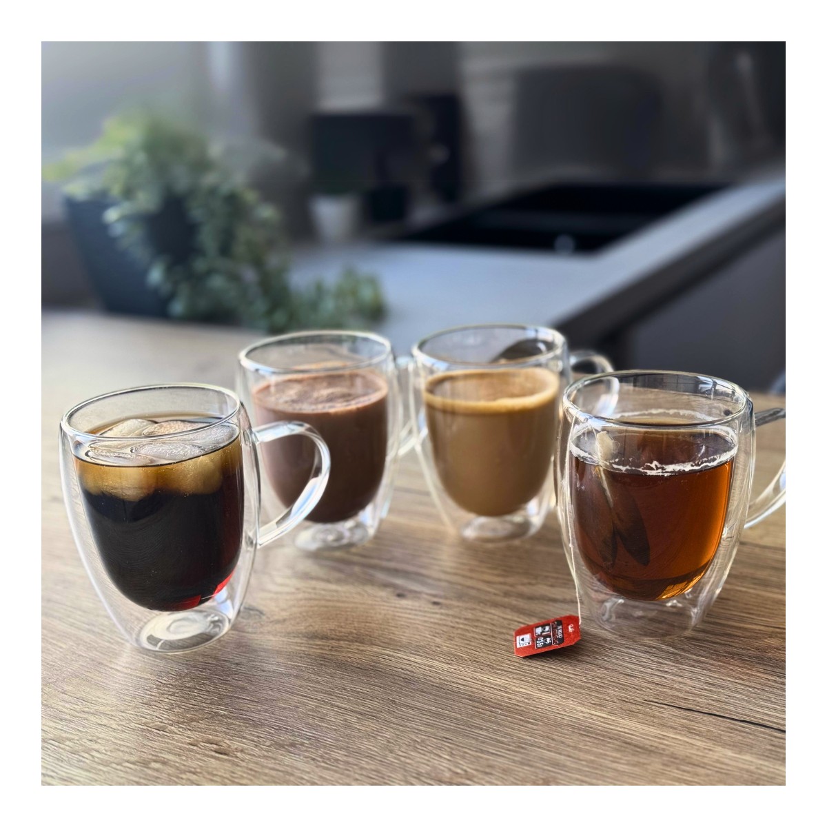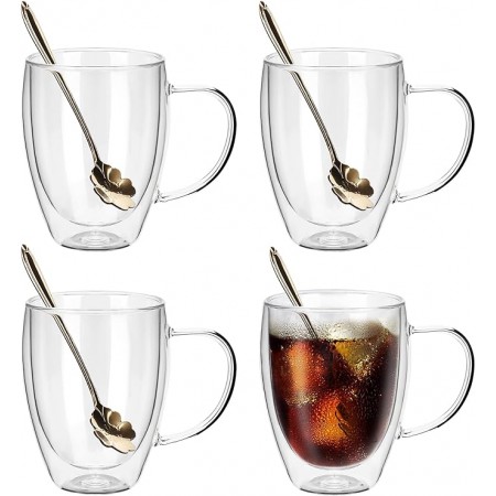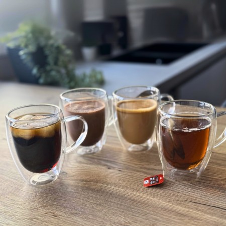 Disfruta de tus bebidas favoritas con estilo y comodidad gracias a este set de 4 vasos de doble pared con asa de 350 ml. Fabricados en cristal de alta calidad, su cristal aislante térmico evita quemaduras al sostener bebidas calientes y elimina la condensación en bebidas frías, manteniendo siempre tus manos secas y protegidas. Cada vaso está soplado a mano, lo que garantiza un acabado ligero, suave y visualmente impecable. Su aspecto elegante y minimalista, con líneas limpias y vidrio transparente, los convierte en el complemento perfecto para cualquier mesa. Ideales para café, té, infusiones, postres y más. Para prolongar su vida útil, se recomienda lavado a mano.
