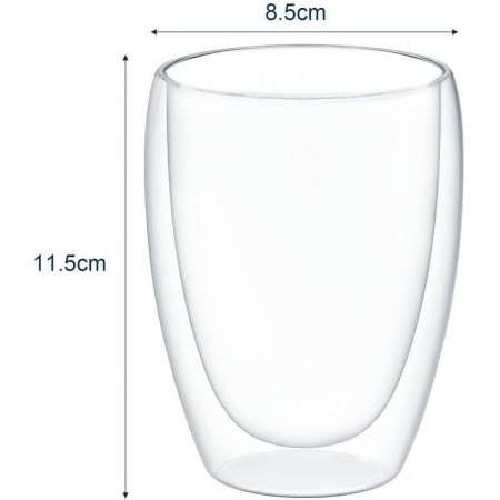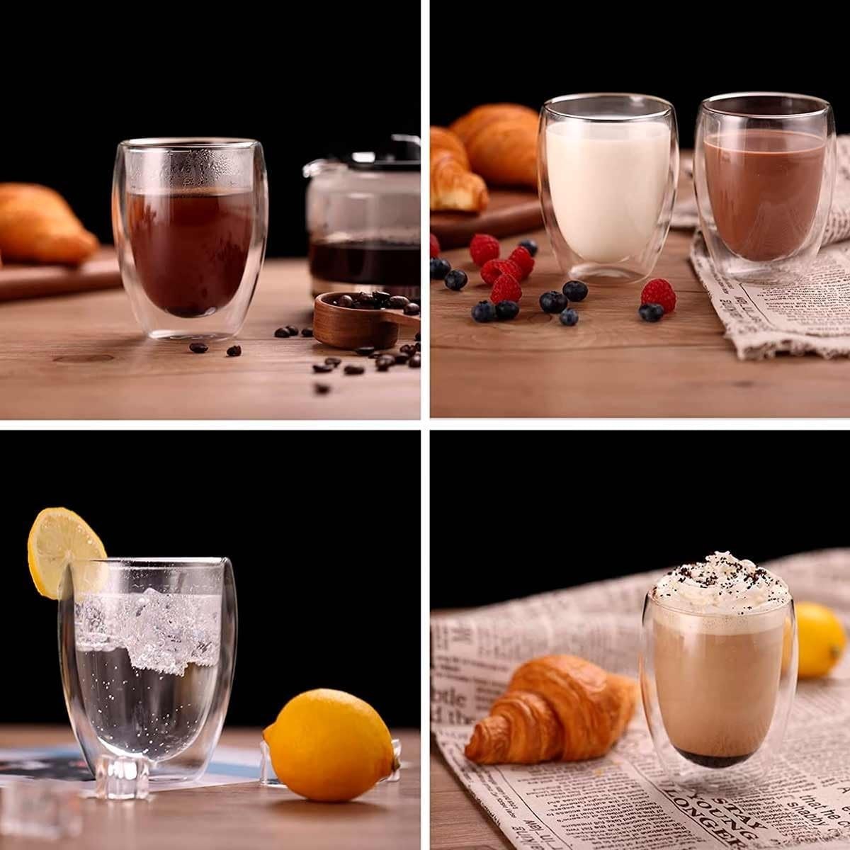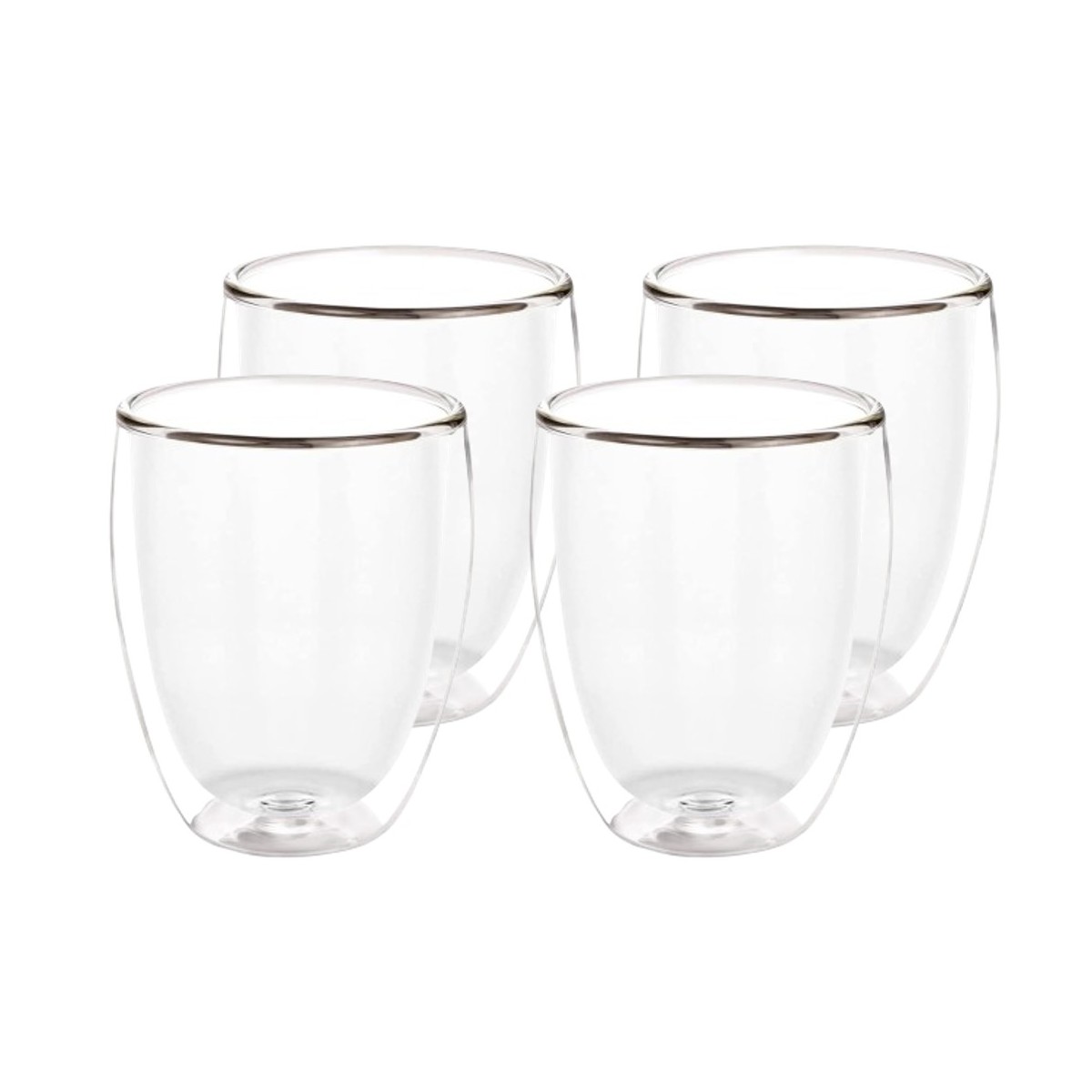 Set de 4 vasos de doble pared de 350 ml, fabricados en vidrio de borosilicato resistente al calor, duradero y libre de plomo. Su diseño térmico mantiene la temperatura de tus bebidas y evita la condensación exterior. Ideales para café, té, bebidas frías o postres, con un acabado elegante, cómodo y seguro para el uso diario.