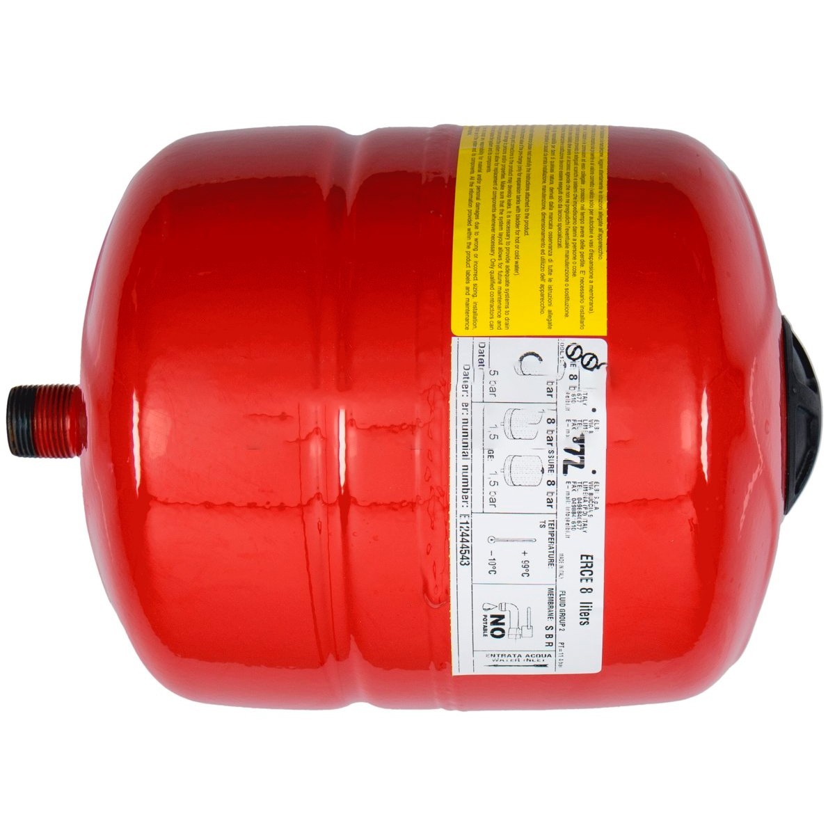 Vaso Expansión Caldera Universal. Fabricante: ELBI Capacidad: 8 litros Diámetro: 205 Altura: 300 Rosca: 3/4". Presión de precarga: 1,5 Bar. Presión máx. de trabajo: 8 Bar. Temperatura de trabajo: -10ºC a 110ºC